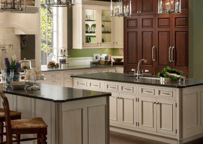 This unique Brookhaven kitchen features a combination of door styles, finishes, and high-end appliances. The perimeter cabinets are Reston raised in Nordic White, the islands are Bloomfield recessed in Cottage Nordic, and the tall cabinets are Springfield raised in Candlelight with black glaze. The custom-made sideboard hutch is a free-standing piece that showcases the Candlelight finish with a black glaze on a combination of Galleria recessed on the base cabinets and Lewisburg on the upper section. Details include beveled glass upper cabinets, unique furniture details on the islands and sideboard, and an assortment of concealed convenience options throughout the kitchen. The kitchen’s focal point is a custom hood with a metalized finish. The Caesarstone countertops are from the Classico series, and the wood floors are by Anderson. Blanco sinks and faucets adorn this kitchen, and appliances are by Sub-Zero and Wolf. This Brookhaven kitchen has a spacious, open floor plan with spectacular lighting from Hudson Valley making it perfectly suited for entertaining or family nights at home. Read more details here…