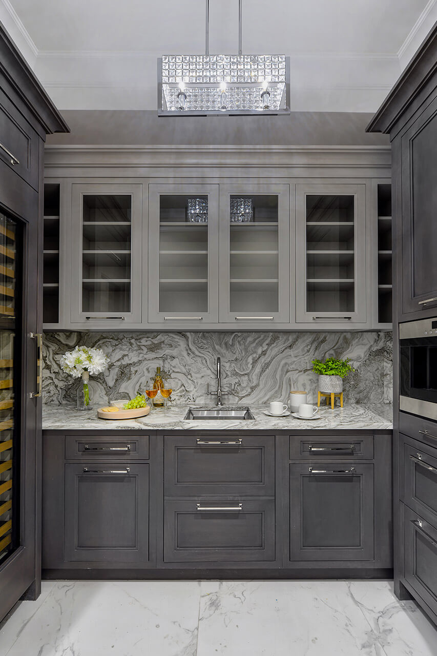Cabinetry Used: Ken Kelly Collection Cabinetry | Wood: Maple Wood | Finish: Satin White (Kitchen) | Island Cabinetry: BROOKHAVEN Design Style II | Wood: Maple Wood | Door Style: Pasadena (Island) | Finish: Shadow Grey (Kitchen) | Raised Countertops: Quartz, Cambria | Color/Style: